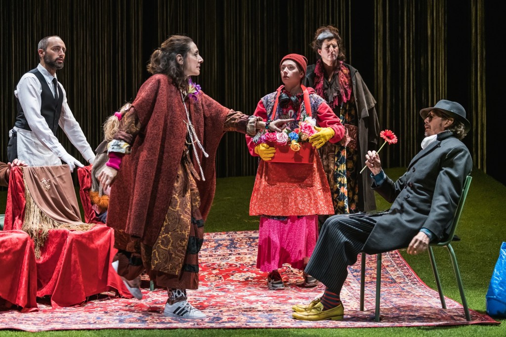 Non importano il nome, lo scopo esplicito, la forma di società, meno domande si fanno meglio è per tutti. Un’altra figura, che fino a quel momento era di spalle a bere acqua seduta a un altro tavolino, prende parola. È il Prospettore (Giulio Cancelli), molto simile nell’abbigliamento e nei modi ai tre, che si avvicina mettendo sul tavolo un nome per la società (qui non è chiaro il passaggio dall’essere uno sconosciuto in un bar al ricevere denaro per la sua trovata); poi innesta nel gruppetto di affaristi un’idea, la sua idea: trivellare Parigi, in particolare il quartiere di Chaillot, per estrarre il petrolio e spazzare via la feccia. Intanto, prima e dopo questo momento, altra umanità fa la sua comparsa: Martial il cameriere (Davide Rossi), Irma (Zoe Pernici), il Sordomuto (Jacopo Morra), il Cenciaiolo (Giovanni Crippa) e la Fioraia (Miriam Podgornik), tutti malamente cacciati dai tre. Appare, poi, lei: la pazza di Chaillot. Aurelie (Manuela Mandracchia) vestita di stracci e accompagnata dal suo fido ombrello.